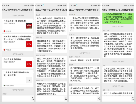 首先,由总支委员、教辅党支部书记共享屏幕为大家播放专题片《领航》第16集踔厉奋发。其次,由党总支书记领读党的二十大报告关于教育、创新的经典语句。第三,读书班全体成员共同学习了引自“学习强国”平台文章——《办好人民满意的教育》、《踔厉奋发 勇毅前行 谱写教育新篇章——学习党的二十大精神》。第四,全体成员在“党的二十大精神专题学习教育读书班”微信群开展学习研讨、畅谈感想。大家纷纷谈思考体悟、讲思路打算,找差距表决心。